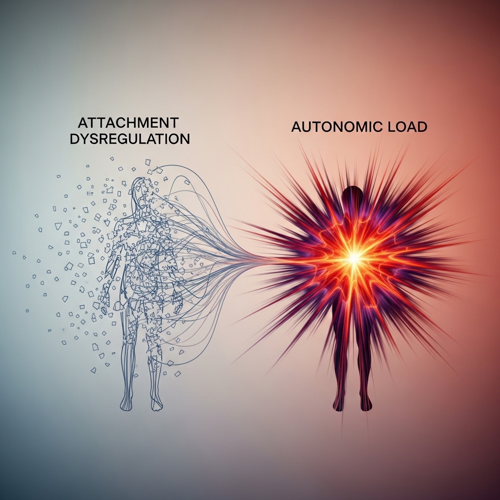 These are not fixed personality traits. Instead, they are dynamic physiological states that shift with the relational environment. A relationship that repeatedly activates attachment threat — through inconsistency, emotional absence, or ongoing conflict — holds the autonomic system in a dysregulated state. The body does not distinguish between a predator and an emotionally unavailable partner when both register as threat.
