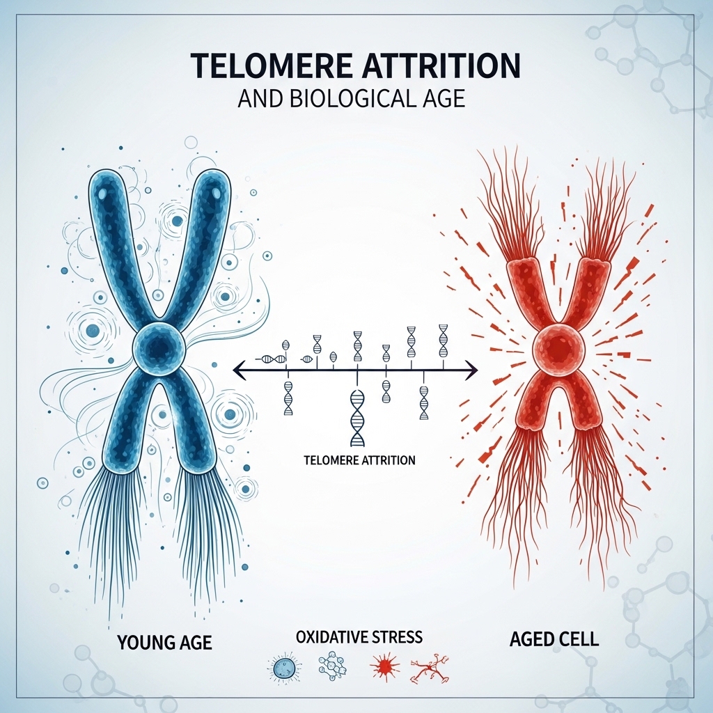 Telomeres — the protective caps at the end of chromosomal DNA — shorten with each cell division and with cumulative oxidative stress. Telomere length serves as one of the most widely used molecular markers of biological age. Accelerated shortening links to earlier onset of age-related disease and reduced lifespan.
