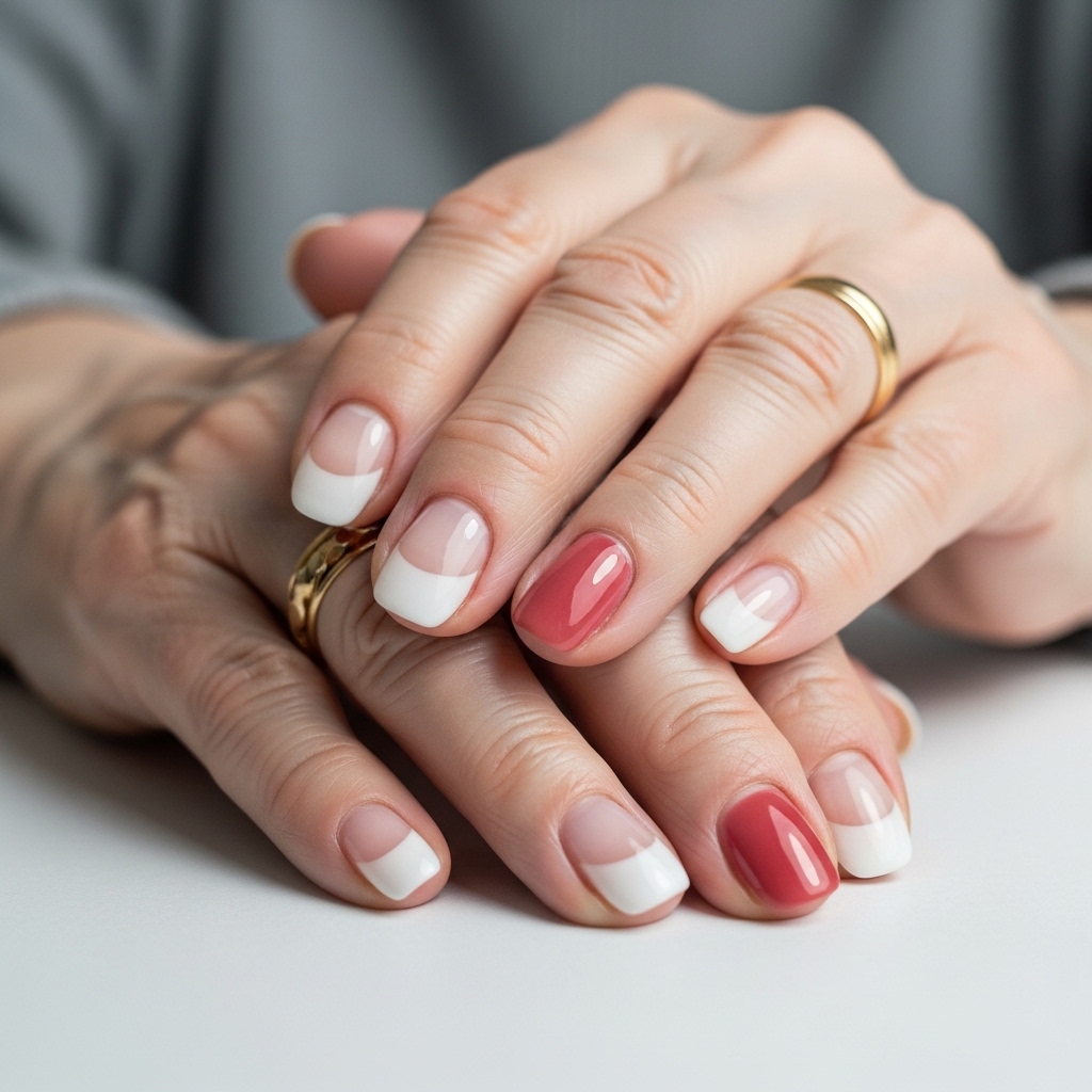 Half-and-half nails — Lindsay's nails — show a white upper half and a brown or pink lower half.