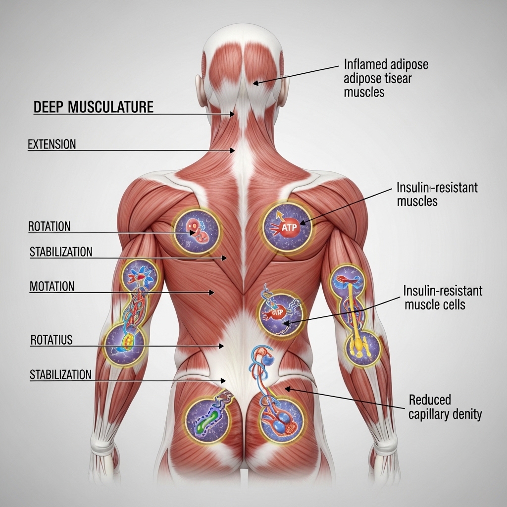 Skeletal muscle is the body's main site for glucose use during and after exercise. The large muscles of the posterior chain — including the lats, trapezius, and erector spinae — make up a significant portion of total muscle mass. When these muscles weaken or shrink, the body's ability to process glucose decreases.