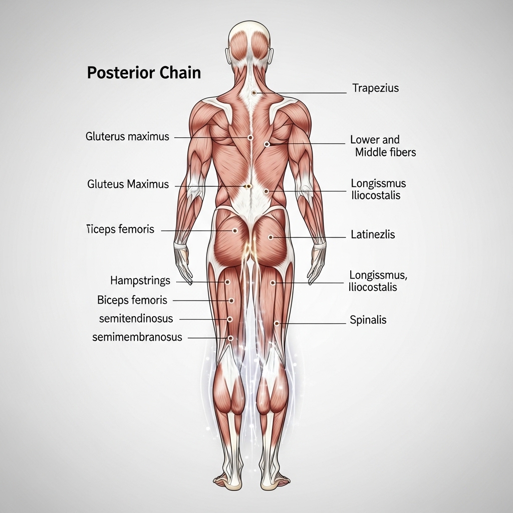 The back is not a single muscle. It is a layered system of muscles, tendons, and connective tissue. This system runs from the base of the skull to the pelvis. Doctors and researchers call it the posterior chain. It controls nearly every movement the body performs — from sitting upright at a desk to lifting, rotating, and absorbing impact.