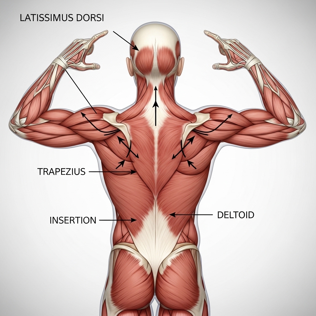 The latissimus dorsi — often called the lats — is the broadest muscle of the back. It connects the upper arm to the lower spine and pelvis, making it one of the longest muscles in the body. Because of this connection, the lap plays a key role in transferring force between the upper and lower body.