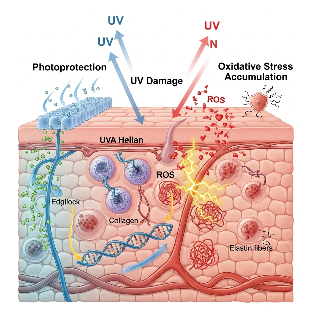 UV radiation is the single largest environmental driver of accelerated skin biological aging. It is responsible for what researchers term photoaging — a process distinct from and additive to intrinsic chronological aging. UV exposure generates reactive oxygen species in the dermis. These damage DNA, degrade collagen and elastin, and disrupt melanocyte regulation. Over decades, this oxidative damage accumulates as reduced collagen density, increased cross-linking of collagen fibers, elastin fragmentation, and uneven pigmentation.