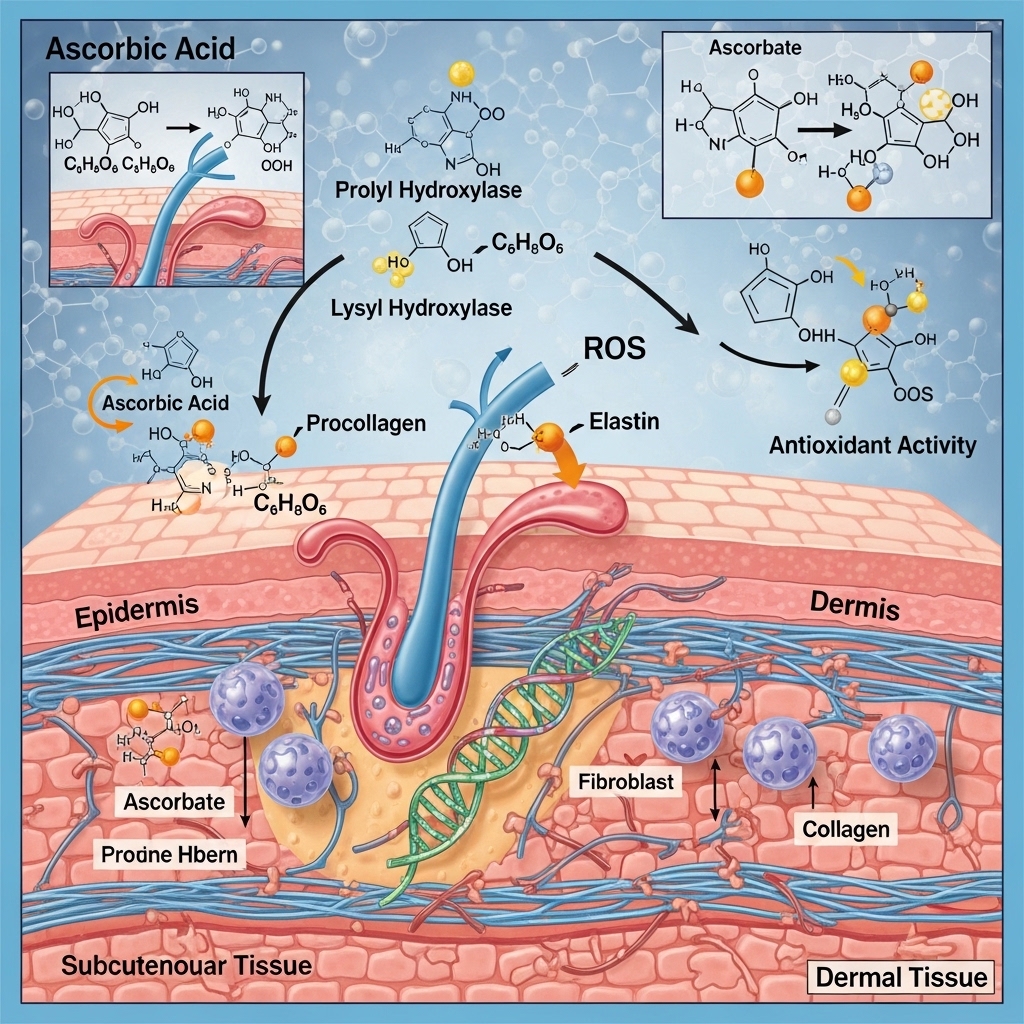 In collagen synthesis, ascorbic acid acts as a required cofactor for the enzymes prolyl hydroxylase and lysyl hydroxylase. These enzymes stabilize the triple-helix structure of collagen molecules. Without adequate ascorbic acid, collagen production continues but produces structurally unstable collagen that degrades more rapidly. In the context of dermal aging — where collagen density declines measurably from the mid-thirties onward — this cofactor role is directly relevant to skin biological age.