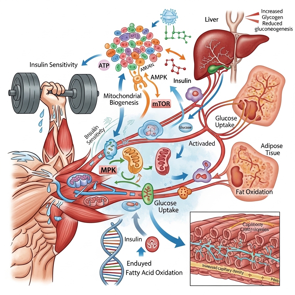 Resistance training supports metabolism through multiple mechanisms. Skeletal muscle is the primary site for glucose uptake, and contraction moves glucose into muscle cells for energy. Muscle activity is therefore central to blood sugar regulation.