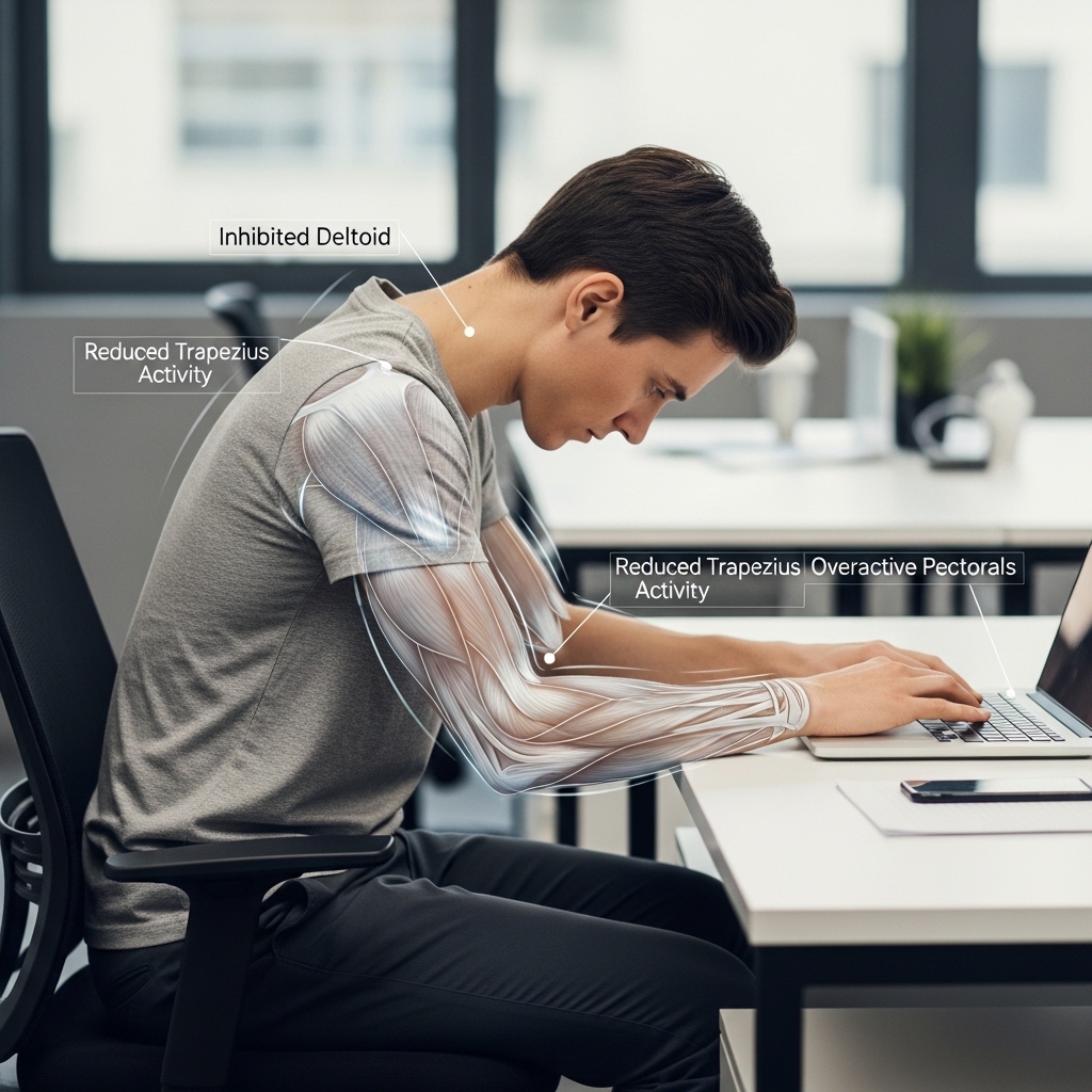 Extended desk work leaves the biceps and other upper-arm muscles largely inactive. Forearm and shoulder muscles may engage lightly, but inactivity gradually alters neuromuscular coordination. Electromyography studies confirm minimal activation of elbow flexors during prolonged computer tasks.