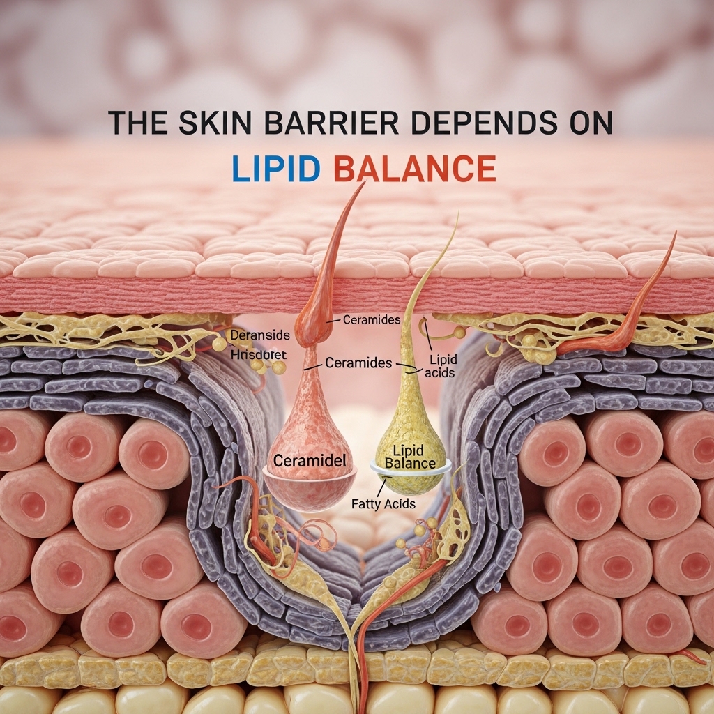 The stratum corneum is the outer layer of the skin. It depends on ceramides, cholesterol, and fatty acids to keep water in and irritants out. When this lipid structure weakens, the skin becomes drier and more reactive.