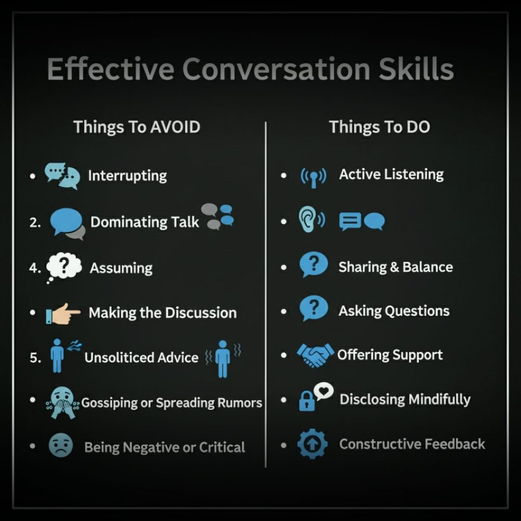 It’s just as important to know what to avoid in a conversation. Stay away from overly personal or controversial topics. These can make others feel uncomfortable. Instead, focus on light, open-ended questions that encourage sharing.