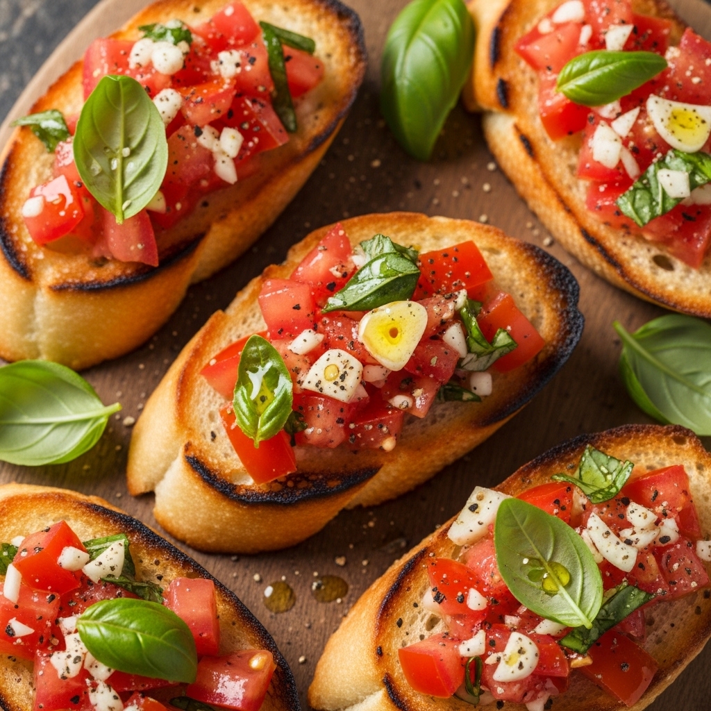 Start with something classic and comforting. A toasted baguette topped with a bright tomato mixture creates one of the most loved easy appetizers. Slice bread, brush lightly with olive oil, and toast it in the oven until lightly crispy. Now prepare your topping. Combine diced fresh tomatoes, minced garlic, basil, and a drizzle of balsamic vinegar. Add a pinch of salt and a touch of olive oil. The mixture becomes vibrant and full of life.