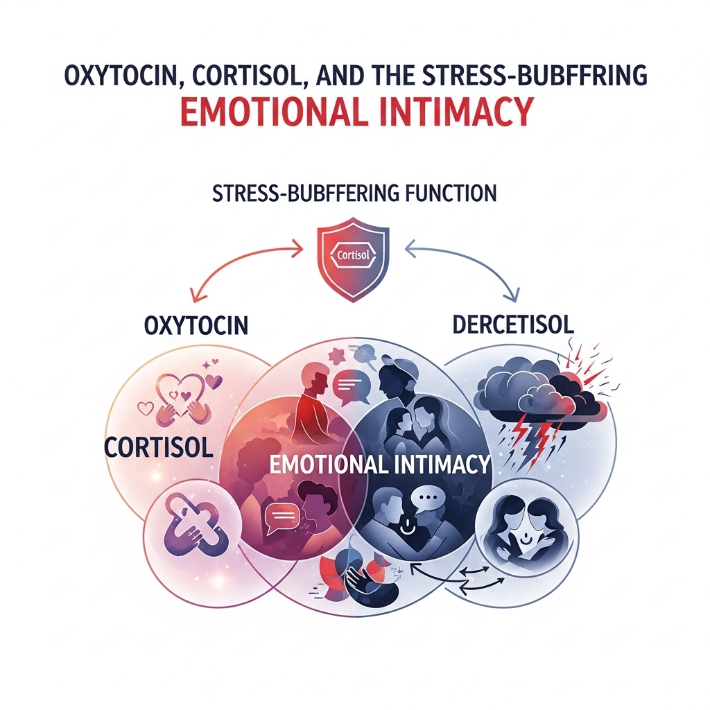 The stress-buffering function of emotional intimacy is one of its most clinically significant properties. When a high-performing professional faces acute or sustained occupational stress, the presence of a deeply connected primary relationship measurably reduces the cortisol response. This effect — documented in experimental stress research — reflects the oxytocin system's capacity to modulate HPA axis activity in real time.