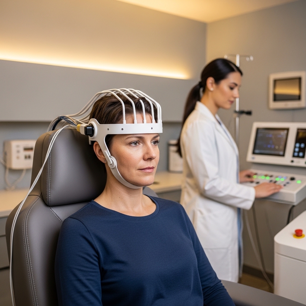 Transcranial magnetic stimulation (TMS) offers a non-pharmacological pathway for TRD. It delivers focused magnetic pulses to targeted cortical regions — primarily the left dorsolateral prefrontal cortex — to modulate neural activity in circuits disrupted by depression. Unlike pharmacological options, it does not require anesthesia and carries a favorable tolerability profile.