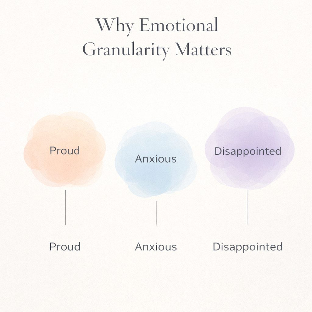 Emotional granularity means being able to name feelings with more detail. Instead of saying “I feel bad,” a person might say “I feel proud, but also disappointed.”