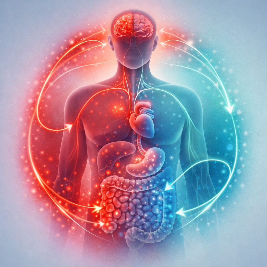 The gastrointestinal tract houses approximately 70% of the body's immune tissue. It communicates bidirectionally with the central nervous system through the vagus nerve, the enteric nervous system, and a dense network of neuroendocrine pathways.