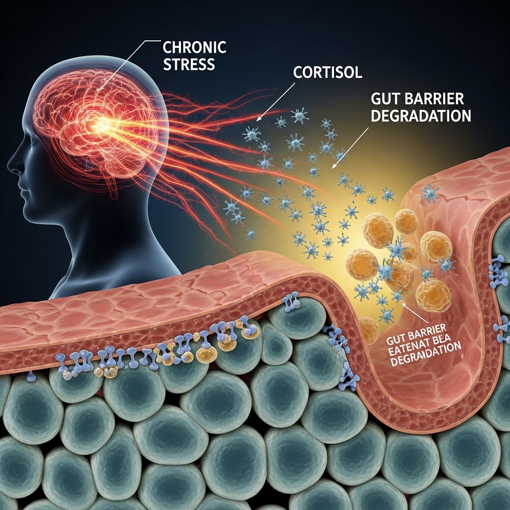 A compounding loop then follows. Stress increases permeability. Increased permeability elevates systemic inflammation. Systemic inflammation amplifies stress reactivity through HPA axis sensitization.